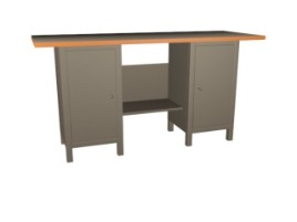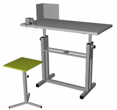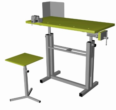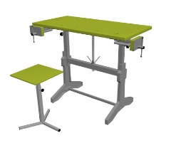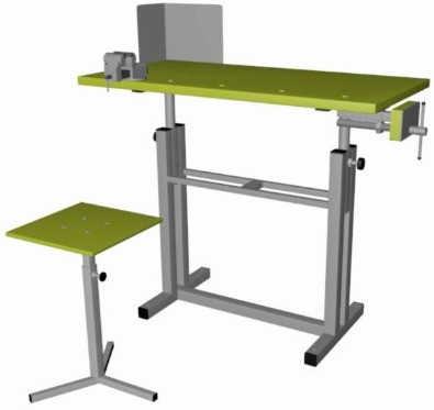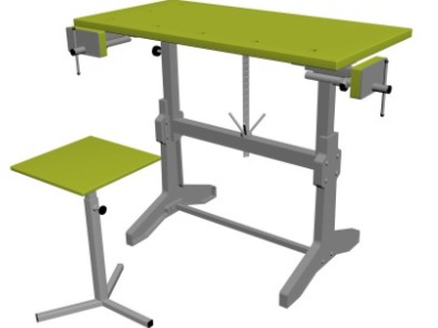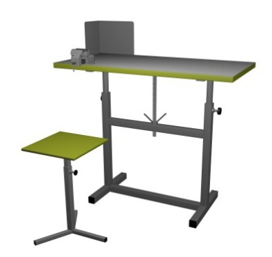 Верстак комбинированный ВК-1-У(РС) на усиленном сварном основании. Габаритные размеры: 1000х500х690-900 мм. В комплекте: табурет (рег. 390-600 мм.), прижим столярный (280 мм.), тиски слесарные (60 мм.) поворотные на струбцине с наковальней и экран защитный угловой. Столешница выполнена из фанеры берёзовой 27 мм. и покрыта прозрачным лаком на водной основе в 3 слоя. Отверстия для установки упора 3/4 дюйма. Столешница регулируется под рост учащегося (690-900 мм). Регулирование высоты верстака ступенчатое. Табурет 3-х лучевой, изготовлен из профильной трубы 30х30х1,5 мм. и 25х25х1,5 мм. Регулировка телескопическая 390-600 мм. Сидение –фанера 12 мм. Лак на водной основе в 3 слоя. Экран изготовлен из листового материала 1 мм. и имеет размеры (ДхШхВ) 200х300х300 мм. Основание изготовлено из профильной трубы 40х40х1,5 мм. и 20х20х1,5 мм. Покраска порошковая Ral 5005. Распределённая нагрузка на столешницу 150 кг. В ножках верстака имеются отверстия, для крепления к полу. Вес ~ 35 кг, объём ~ 0,15 м3 Срок изготовления — от 7 до 15 раб.дней.